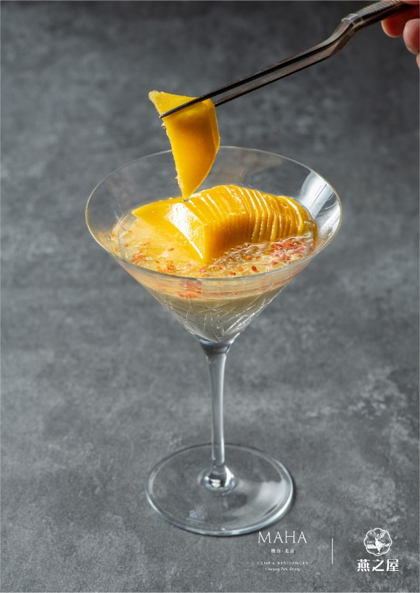秋葵黃魚燕窩羹,燕窩經(jīng)凈水浸沐6小時,換水滌塵,撕作雪絲隔水輕燉;黃魚淋開水封鮮,煎至金黃生香,搗碎入滾水熬至濃白;秋葵片灼水,如玉簪點入羹中。這一盅融深海之鮮、燕窩之潤、青蔬之清——沿襲古法,讓食養(yǎng)同源的美味在舌尖化開。發(fā)酵酸湯龍蝦趴燕窩汁,龍蝦肉冷腌15分鐘,裹上特調(diào)漿粉炸出金黃蜂巢脆衣,咬下時“咔嚓”聲如秋葉碎響。番茄經(jīng)自然發(fā)酵成琥珀酸湯,澆淋現(xiàn)燉燕窩汁——酸鮮激蕩中,燕窩柔滑如綢緞?chuàng)徇^舌尖,是主廚獻給味覺的冒險詩篇。芒果酒釀桂花蜜蛋糕配新鮮芒果及燕窩:“燕窩需隔水輕蒸,裹住桂花蜜的魂。”主廚將酒釀熬作凝脂奶凍,托起卡曼橘芒果慕斯的俏皮酸香。頂層燕窩如琉璃凍雨,新鮮芒果是點睛明月。撒入桂花,取“蟾宮折桂”的好兆頭。當瓷勺探底——酒釀的醇厚、慕斯的輕盈、燕窩的滑潤在口中共譜秋月的詩篇。